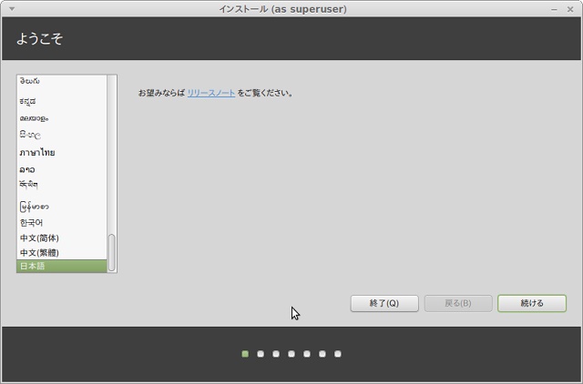 - 『Welcome』画面でインストール画面での言語を選ぶ。一番下に日本語があります。
